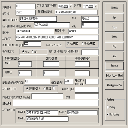 Hospital Management Information SystemClientRawalpindi Eye Donars Organization (REDO)Used Tools & TechnologyVisual Basic 6.0, Microsoft SQL Server 2000 and Crystal Report DescriptionHospital Management Information System includes following modules Patients Registration Management System, Operations M.S.,Employees Payroll M.S, Account M.S, Dialysis Wing Management System and Mother Child Health Care Management System. Screenshots